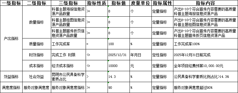 昆明科普中心2025年开展两项重点项目,分别为“《昆明科技》专项编印业务经费”、“科普信息资源产品开发项目经费”。两个项目分别设置整体项目年度绩效指标,及三级指标细项。具体设置情况如下: