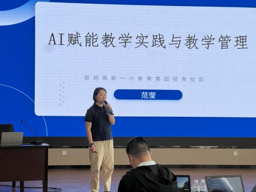培训会上,来自昆明高新一小(经典校区)的范莹老师以《AI赋能实践与创新管理》为题,从人工智能的基本原理和发展趋势出发,结合教育、农业、文旅等多个领域的经典案例,生动展示了AI技术在现实场景中的广泛应用。在教学方面,她重点介绍了AI如何助力课堂互动、个性化辅导和教学管理优化,并鼓励教师结合石林彝族文化资源,开发具有地方特色的AI融合课程,推动教学方式创新。